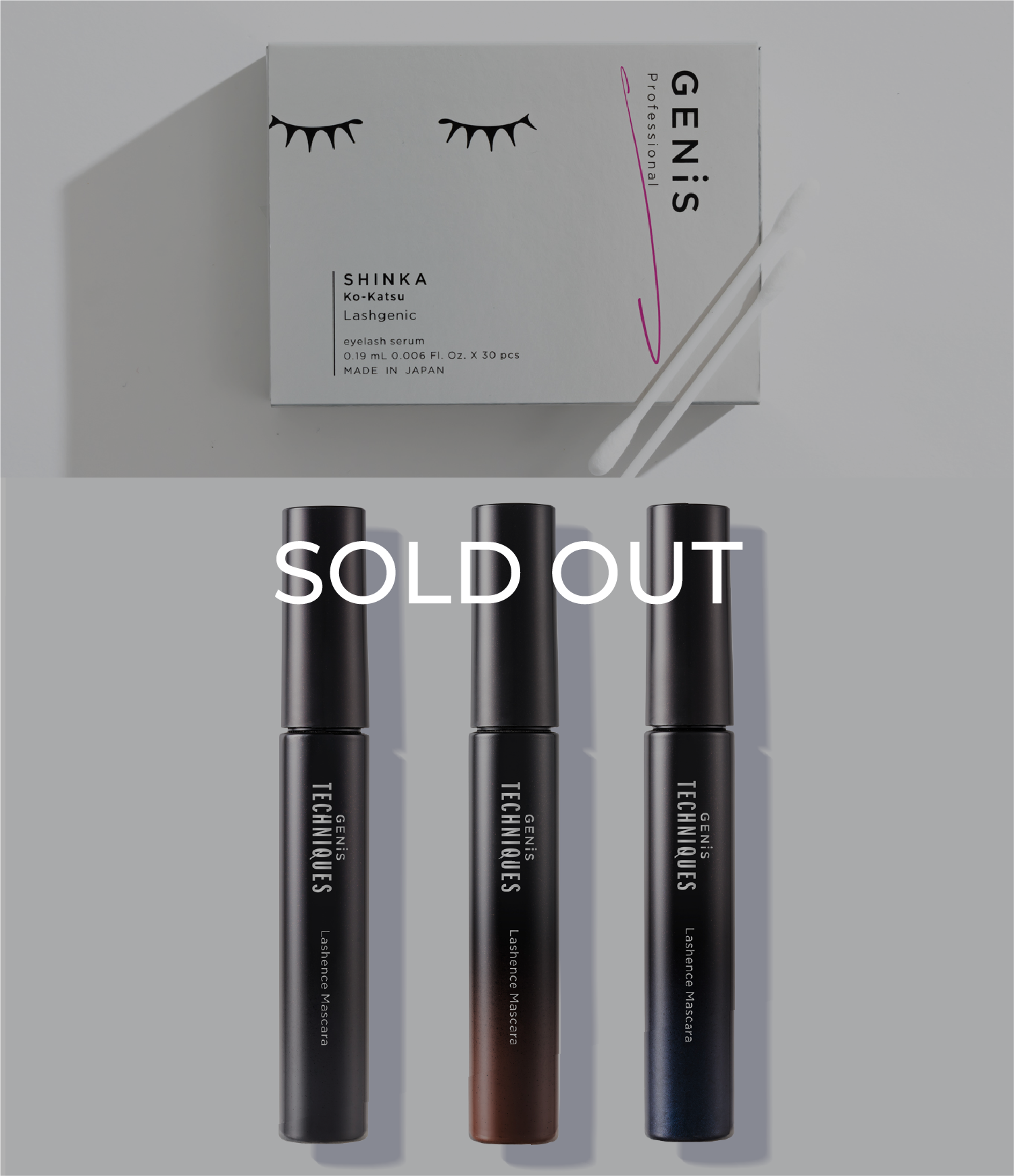 GENiSの大人気まつ毛美容液とマスカラ全3色がセットになった数量限定商品。